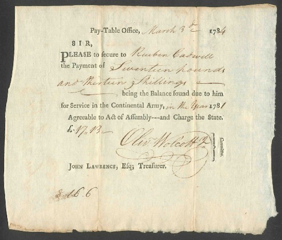 Future Secretary of Treasury and Governor of Connecticut Oliver Wolcott, Jr. Authorizes Payment for 1781 Continental Army War Service of Reuben Cadwell Whose Light Infantry Regiment Served With the Marquis De Lafayette's Division and George Washington in Battle of Yorktown