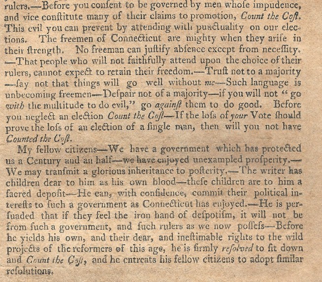 "Count the Cost" is a famous political pamphlet which is cited in Richard Purcell's influential book, "Connecticut in Transition 1775-1818" and has been put in digital form by Project Gutenberg. Price: $75 Pay securely with credit card through PayPal by clicking the button below
