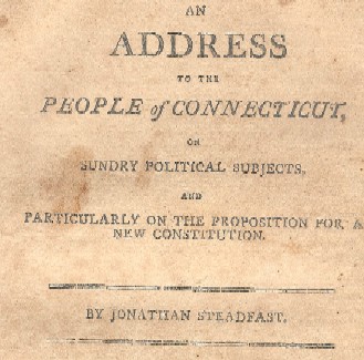 This pamphlet was written by David Daggett who after he wrote the pamphlet became a United States Senator, Mayor of New Haven, founder of Yale Law School and Chief Justice of the Connecticut Supreme Court. In this famous pamphlet Daggett uses the appropriate pseudonym "Jonathan Steadfast" to argue against claims by Jeffersonian Republicans that Connecticut needed a new written Constitution that eliminated the Congregational religious establishment and separated government functions. Daggett's arguments won the day in Connecticut elections until 1816-1818 when the revolution against the Standing Order of Federalists and Congregational Church was brought down by Connecticut's voters and a new Constitution was adopted. Below is the concluding argument in the 21 page pamphlet.