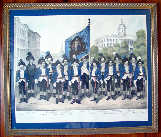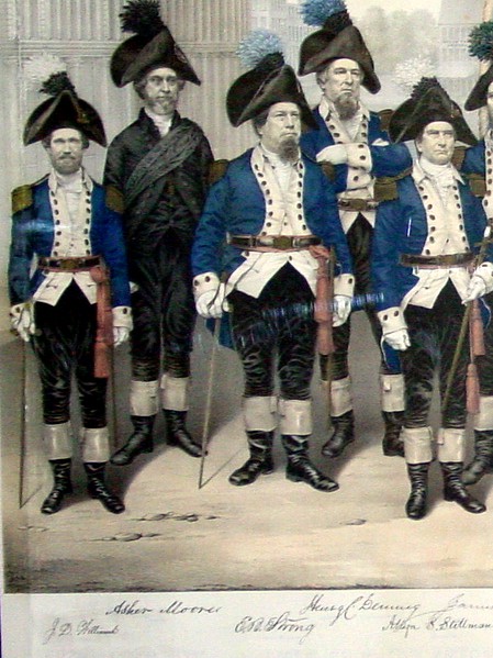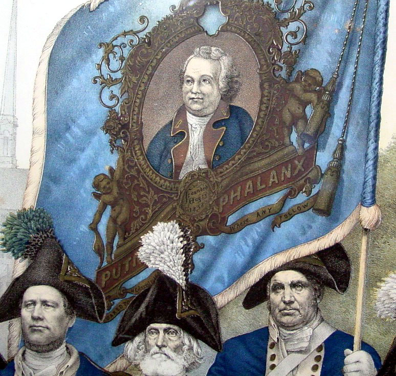 Very Rare and Colorful 1861 Print of Officers and Staff of the Putnam Phalanx As Originally Constituted In Front of the Old State House in Hartford Actual Portraits and Facsimile Signatures of Each of the Officers and Staff, Some of The Leading Names in Hartford This is wonderful rare historic print of the famous Revolutionary War marching unit honoring General Israel Putnam that was formed in Hartford in 1858. The men are clothed in the jaunty dark blue uniforms that are a replica of the uniform worn by Israel Putnam in the Revolutionary War, which made them a very popular marching group from their inception through the 20th century. Very few of these 1861 prints were made by the Bingham, Dodd & Co of Hartford and far fewer have survived, such that even historians in 1900 were not aware of their existence. The print shows that the leading men of Hartford in detailed portraits with the signatures underneath the print. They looks very serious about their civic duties and honoring the noble and courageous heritage of Connecticut arms. The print has a wonderful historic setting, the troops are standing in Hartford with the historic Old State House at their backs and their armory on Main Street and church steeple in the background. Below are a picture of the print as framed; some close-ups of the print, including the flag and some of the portraits; details of what is written on the print, including the names of the uniformed men; some history of the Putnam Phalanx, including an interesting incident on the eve of the Civil War; and an explanation of why we believe it is a very rare print.