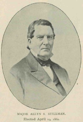 The pictures above are of the five officers and staff of the Phalanx on the left of the print along with their signatures. The men and their ranks shown are J. D. Williams, Adjutant; Asher Moore, Chaplain; E. B. strong, Quarter Master; Henry C. Denning, Asst. Commissary; and Allyn S. Stillman, Captain. Stillman was the first Republican Mayor of Hartford and he served in that position from 4/11/1864 - 4/9/1866. Mayor Stillman is shown below a little older than in our print.