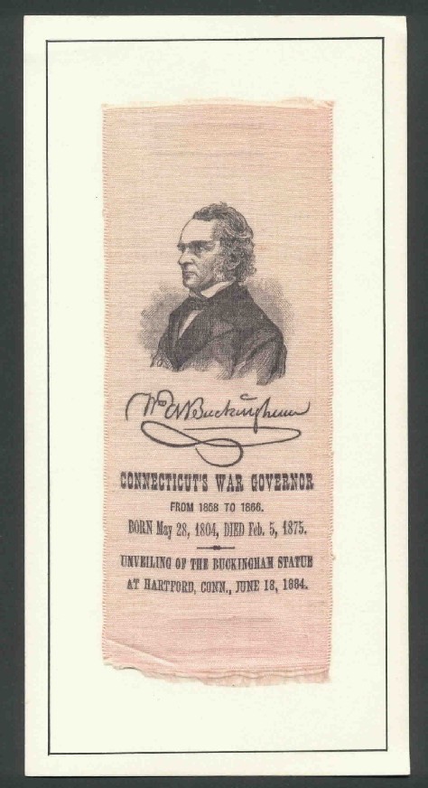 Ribbon Commemorating the Unveiling of The Statue of Connecticut's Civil War Governor William A. Buckingham This is a rare ribbon issued in 1884 to commemorated the unveiling of the statue of William A. Buckingham on the lawn on the Western end of the State Capitol in Hartford, Connecticut. The statute was executed by Olin L. Warner of New York. Governor Wailer uncovered the statue and an address was delivered by United States Senator Orville H. Platt. The ribbon is 2 3/8" wide by 6 1/4" long and is mounted on a card as shown. Information on Governor William A. Buckingham