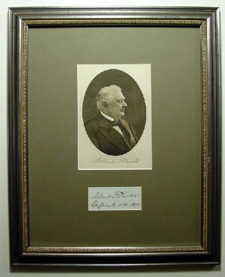 This is a autograph of President Millard Fillmore that was signed in Buffalo, New York on April 14, 1870 that is nicely framed, matted and glazed with a portrait of President Fillmore. The story of Millard Fillmore is the story of Horatio Alger in real life. His family was so poor that they sold him into indentured servitude and he received a mere six months of formal education, but his thirst for learning and ambition eventually made him a lawyer, Congressman, chief financial officer of the state of New York and eventually President of the United States. The later job came to him after President Zachary Taylor died in office in July 1850. Fillmore quickly allied himself with Speaker of the House Henry Clay and Senator Stephen Douglas and appointed Daniel Webster as Secretary of State. Together they supported the famous Compromise of 1850 which admitted California as a state but as a condition to mollify the South, passed the Fugitive Slave Law. By the later measure he lost the political support of the North and by not opposing the invasion of Cuba he lost the South. As a result he could not win renomination as the dying Whig Party candidate for President and Fillmore was the last Whig Party candidate to be President. Below is a close-up of the portrait with facsimile autograph and the authentic autograph of Fillmore.