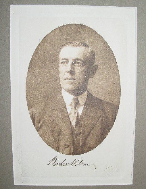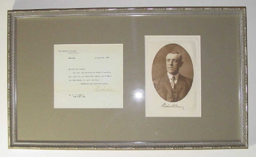 The most difficult decision of Woodrow Wilson's Presidency was whether to join the war on the European continent and the White House letter offered here was written in the momentous year of 1917 when Wilson and Congress declared war on Germany. The letter is written to W. A. Rogers, the editorial cartoonist for the New York Tribune who had gained fame previously as the political cartoonist and illustrator for Harper's Weekly. W. A. Rogers in 1917 published a book of his largely anti-German editorial cartoons from the New York Tribune entitled "America's Black and White Book: One Hundred Pictured Reasons Why We Are At War" and sent complimentary copies to Woodrow Wilson, Theodore Roosevelt and others. In Wilson's letter shown above he thanks Rogers for sending him a copy of "your attractive album" which refers to the Rogers book with 100 cartoon plates. I also owned the letter Theodore Roosevelt sent to Rogers on October 25, 1917 in response to the receipt of the same Rogers book which was more effusive in praise, especially for clearly blaming the Germans for World War I, and that sold at R & R Auctions for $2,000 in April, 2005. President Wilson was far more reluctant about going to war than Theodore Roosevelt. World War I started in 1914 and Germany sunk many vessels with American citizens, including, most famously, the Lusitania in 1915. But it was only after the Germans declared a policy of unbridled submarine warfare in January 1917, including those of neutral countries such as the United States, that President Wilson went before a joint session of Congress on the evening of April 2, 1917 and asked for a declaration of war against Germany in order to "make the world safe for democracy." On April 4, Congress granted Wilson's request. Below is the picture of Wilson with facsimile autograph that is framed with the authentic White House letter to Rogers. The framed White House letter and portrait make a nice impression. The letter itself is captured well by the detailed photograph above, with the horizontal fold and some darkening at the fold and top. Wilson's signature is a bit light but completely visible. It is a wonderful memento of President Wilson, World War I and the correspondence of Presidents with members of the Press. Price: SOLD |