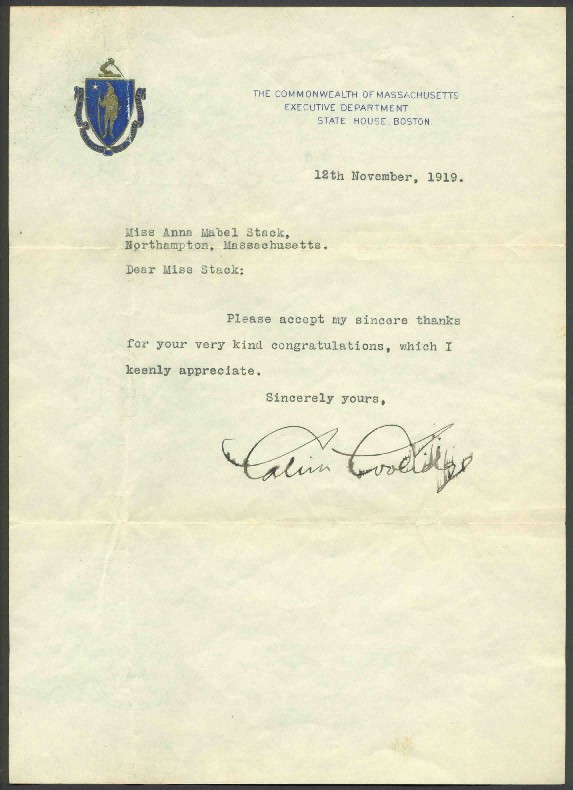 In this letter Governor Calvin Coolidge acknowledges congratulation on his reelection as Governor from a supporter from his hometown of Northampton, Massachusetts where he served as Mayor and returned to after leaving the Presidency in 1929. In the flurry of sending out the many congratulations he was receiving, especially after the notoriety surrounding his conduct in the Boston Police Strike, Coolidge got a little sloppy with this letter and must have brushed his hand across his signature immediately after signing it. The letter is in nice condition and measures 7 3/8 x 10 1/4 inches. Price: $250