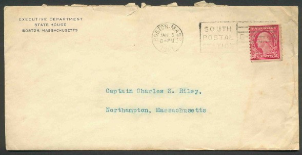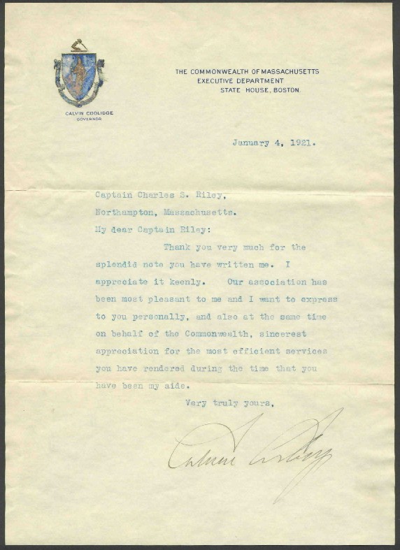 This letter signed by Governor Calvin Coolidge was written after he was elected Vice President of the United States but before he left he post as Governor of Massachusetts. The letter is written to his military aide as Governor thanking him for his service as he is about to depart for Washington to assume the duties as Vice President. This letter has a better letterhead than most of Coolidge's letters as Governor (his name is under the state seal) and it shows how kindly and appreciative he was to the people who worked for him. The original envelope, shown below, is included.