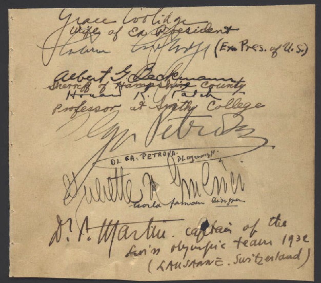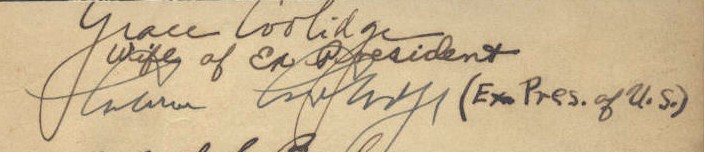 This is a page from an autograph album that was signed by Grace Coolidge and Calvin Coolidge after they return to Northampton, Massachusetts after serving as President of the United States. Most of the other autographs appear to be local, such as the Sheriff of Hampshire County and a Professor at Smith College, directly below the Coolidge autographs. The only other autographs that may be significant are the musical comedy star Lou Holtz and Italian baritone opera singer Pasquale Amato who both sign at the bottom of the reverse side of the album page. It also includes the captain of the 1932 United States Olympic swimming team.