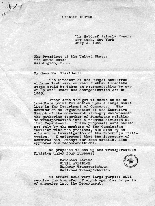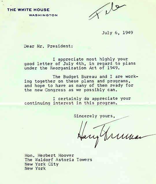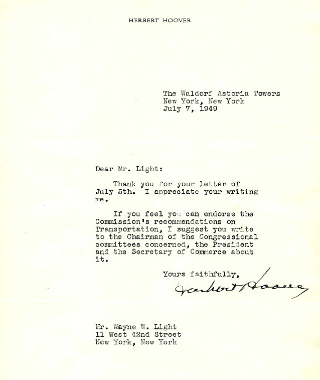 This 1949 letter concerns the work of the Hoover Commission on Organization of the Executive Branch of the Government, which President Harry Truman appointed Herbert Hoover to head. This letter was written in 1949 the year the Commission made its recommendations and the letter concerns the Commission's recommendations on Transportation and Hoover suggests that the addressee, Wayne W. Light, lobby Congress, The President and the Secretary of Commerce on behalf of the recommendations. The Truman library web site has some relevant letters pictured below that show that the Transportation recommendations of the Hoover Commission had been the subject of correspondence between Herbert Hoover and President Truman earlier that same month. Hoover at the time was living at the Waldorf hotel in New York City, which is reflected in the letterhead of our letter as well as the one to President Truman shown below.
