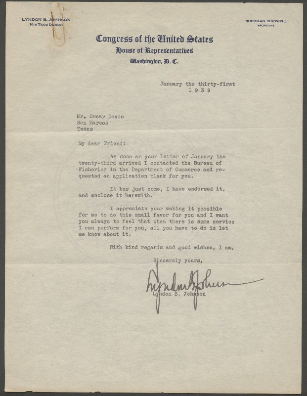 The letter shows Johnson's political touch, learned in part as Secretary to Congressman Richard M. Kleberg in 1931, where he always responded swiftly and effectively to district voter concerns. The letter notes "as soon as your letter arrived" Johnson sprung into action and "contacted the Bureau of Fisheries," got the requested form and "I have endorsed it," and then thanks the constituent for "the opportunity to do this small favor for you." Johnson throughout his career was a master of the personal touch and of patronage to gain power and influence and this shows a very early example of his talents.