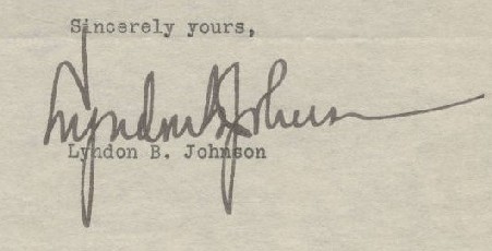 The letter also bears evidence of his remembrance of his experience as a legislative secretary and the important role the secretary played in those days by including the name of his own secretary, Sherman Birdwell, on the right corner of the stationary. This letter is before the autopen was widely used and before Johnson had a large staff to sign all his letters and at time when he was used to doing this kind of work himself. The B. is disconnected from the J of Johnson like many of his authentic early signatures. It is a wonderful early example of Johnson's official letters giving a good view of him as the early master politician. Price: $225/SOLD