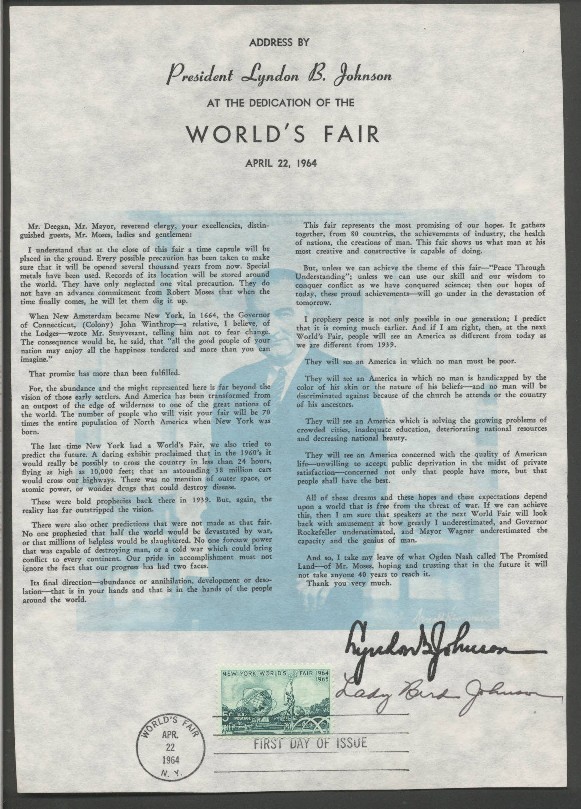 This document is entitled "Address by President Lyndon B. Johnson At The Dedication of the World's Fair April 22, 1964." The body of the document is President Johnson's speech with a portrait of the President. At the bottom it has a postal stamp for the New York World's Fair and a postal cancellation dated April 22, 1964 and the signatures of Lyndon B. Johnson and Lady Bird Johnson. A close examination of the signature indicated that the President's signature is a facsimile preprinted with the document and the First Lady's signature is authentic. This is a nice item for Presidential or First Lady collectors as well as world's fair and stamp collectors. Price $55/SOLD