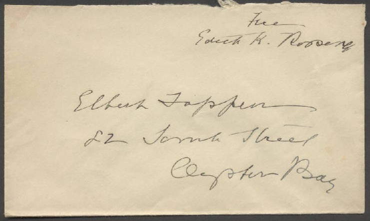 This is an envelope addressed by First Lady Edith Carow Roosevelt and free franked by her with her signature and the word "free" above her signature. The envelope was written by her at the Roosevelt home in Oyster Bay, New York and written to a fellow resident of Oyster Bay, Elbert Tappen.