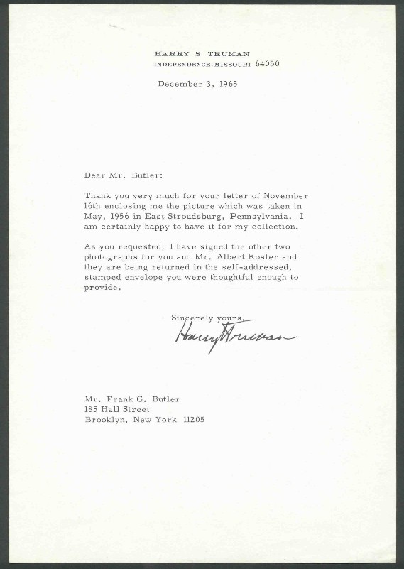 This letter shows you down to earth and helpful Harry Truman was as former President, giving autograph seekers nice service without complaint. The letter measures 10 1/2 X 7 1/4 inches and is in very nice shape with some rubbing above letterhead. Price: $150