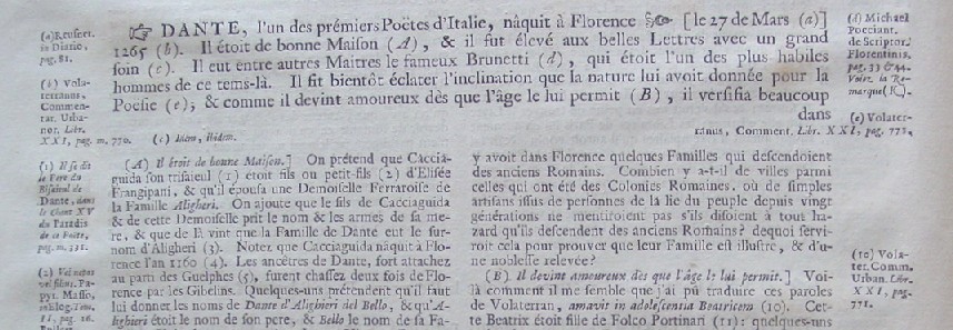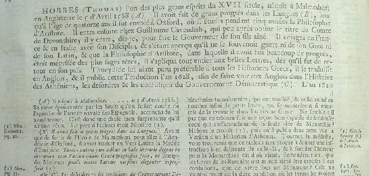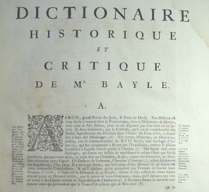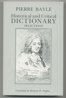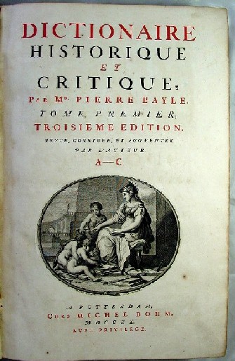 From Pierre Bayle's Dictionary Web Page Pierre Bayle's Dictionnaire historique et critique stands as the supreme achievement of one of the seventeenth century's most prominent men of letters. Based in Rotterdam, Bayle animated intellectual discussion in Europe through his work as editor and author and as a prolific correspondant. Originally conceived as a response to the errors in Louis Moréri's Grand dictionnaire historique, his Dictionnaire historique et critique grew to be an exemplary work of critical methodology. The author painstakingly compiled, compared, questioned, seeking some degree of historical certainty, however small. The Bayle Dictionnaire has been called the "Arsenal of the Enlightenment", pillaged and re-edited throughout the eighteenth century by believers and sceptics alike who gathered ammunition for philosophical argument in the work's recondite notes. In addition to the eight French editions in fifty years, the Dictionnaire was translated into English (two versions, 1709, 1734-1741) and German (1741-1744). Said Voltaire: “the greatest master of the art of reasoning that ever wrote, Bayle, great and wise, all systems overthrows.” In Diderot's famous Encyclopédie Bayle is mentioned in more than 100 articles. This third edition is well described in an American Book Exchange (ABE) listing for the four volumes priced at $4,200, which is excerpted below: