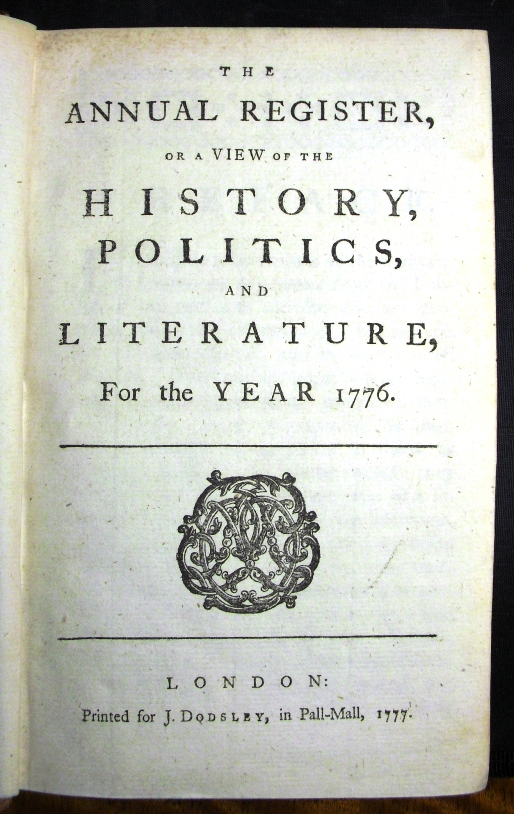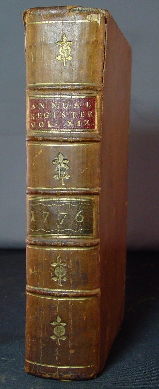 1776 Annual Register 1st Edition Early Publication of Declaration of Independence and Articles of Confederation Filled with Contemporaneous Reports of American Revolution Book Reviews of Adam Smith's Newly Published "Causes of the Wealth of Nations" and Gibbon's "History of the Decline and Fall of the Roman Empire"