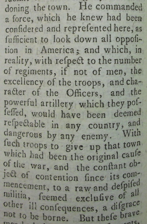 The excerpt below shows how embarrassing it was for the British to have to abandon Boston: "With such troops to give up that town which had been the original cause of the war, and the constant object of contention since its commencement, to a raw and despised militia, seemed exclusive of all other ill consequences, a disgrace not to be borne."