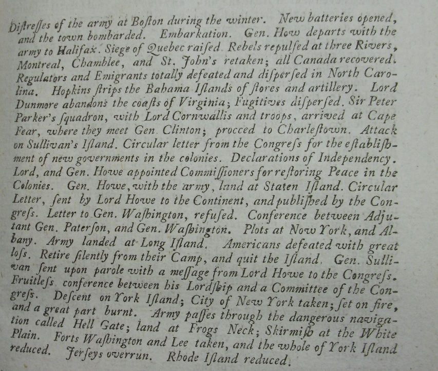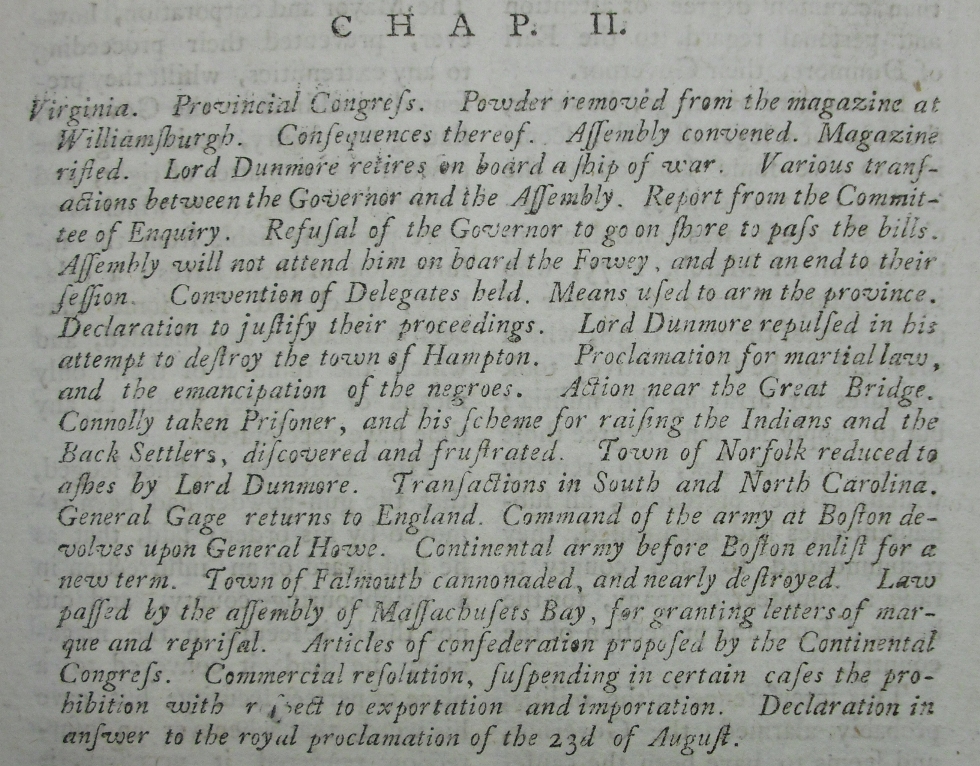This is the Annual Register for 1776 which contains an extensive review of the historic events and document of 1776 in America and England. The accounts and documents were fresh and vibrant to the writer and readers who were reading about events that intimately affected them and the end result of the Revolutionary War was unknown at the time. This book contains all the important events of 1776, the invasion of Canada led by Benedict Arnold, the Battle for Boston won by the Americans through the fortifications quickly built on Dorchester Heights, the successful defense of Charlestown, the events in Virginia leading to Governor Dunmore's abandonment of the capitol of Williamsburg and emancipation of slaves, the Declaration of Independence and Articles of Confederation, the British Invasion of Long Island, Manhattan, the Hudson River and New Jersey, etc., etc. Below are some of the text from this volume recounting those events and some of the critical documents, including a very early publication of the Declaration of Independence in book form. The first chapter summarizes the events in America in 1775 and the invasion of Canada by Arnold and the second chapter, summarized below, focuses on the events in Virginia where Governor Dunmore abandoned Williamsburg, issued a "Proclamation for martial law, and the emancipation of the negroes." The summary of the 7th chapter shown below mentions some of the most momentous events in American history, including the Declaration of Independence and the British invasion of New York. The British occupying Boston got a big surprise when the guns seized from Fort Ticonderoga suddenly appeared on Dorchester Heights and made their occupation of Boston militarily impossible.