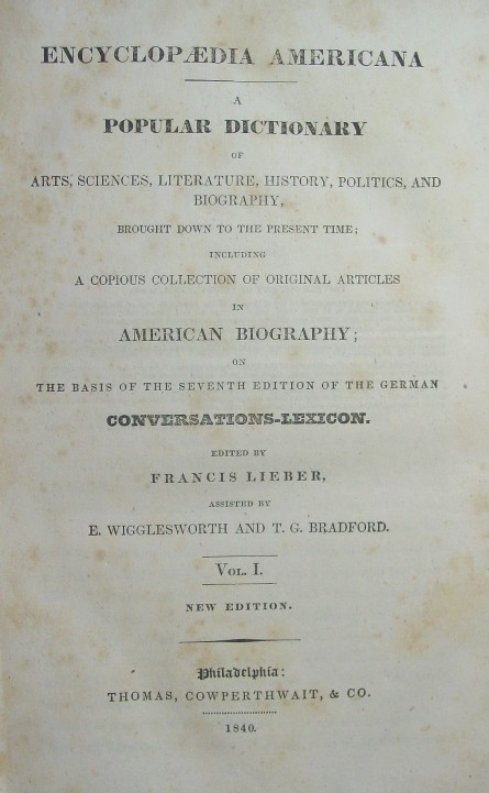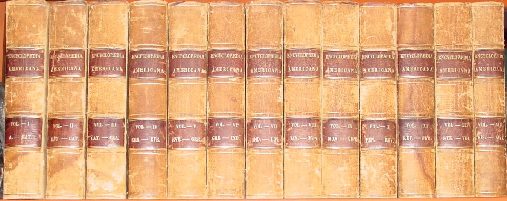 Offered here is a wonderful set of books setting forth the state of knowledge early in the 1800s in America and Germany. These early editions of the Encyclopedia Americana were edited by Francis Lieber, who engaged several distinguished specialists to update and enhance the original Conversations-Lexicon (published by Brockhaus in Germany) for an American audience. The more than 120 pages of unsigned entries on natural law, American and English law written by Joseph Story are especially noteworthy. During the time Joseph Story wrote these articles (1829-33) he was both an Associate Justice of the Supreme Court, serving with the legendary Chief Justice John Marshall, and Professor of Law at Harvard University. At the time he started writing these articles he was in his judicial and law writing prime, he was not yet 50 but had served on the Supreme Court for over 17 years and was in the middle of writing his most famous treatises or commentaries on the law (e.g., The Constitution of the United States (1833) and Conflict of Laws (1834)) John C. Hogan, relying in large part on letters from Justice Story's son, William Wetmore Story, identified the articles written by Justice Story in an article in the Law Library Journal. "Joseph Story's Encyclopedia Americana Law Articles," 48 Law Library Journal 117 (1955). The twenty one (21) articles that Justice Story wrote that are included in these thirteen volumes are the following::