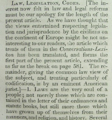 Below are the portions of the text in which the editor Lieber refers to the contribution of original articles on the law, first in the preface and then in the section on "Law, Legislation, Codes" where he refers to the contribution of "an eminent American jurist."