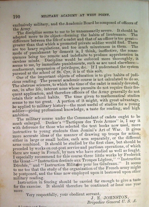 A particularly astute and learned letter came from Joseph E. Johnston, already a General before the Civil War started.