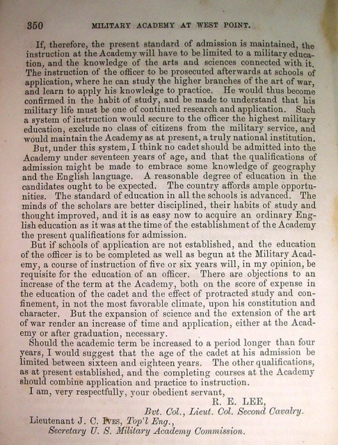 Government Printing Office., Washington D.C.: published date: 1860. Hardcover. Original blind-stamped brown cloth. This is a very detailed report of the activities and findings of this Commission. Jefferson Davis, then a United States Senator was president of the commission. The last letter in the report to the commission in response to questions regarding what changes should be made at West Point to obtain the best officers qualified to perform their duties was from then Brevet Colonel Robert E. Lee, stationed in San Antonio. There are many other famous names who responded with letters appended to the report: George G. Meade (Capt.), A. H. Whipple (Capt), Winfield Scott, General Joseph E. Johnston and many others. Binding is rubbed and worn along edges, text is clean and the binding is tight and very good. 350 pages. Below is a sample of the comments contained in the letters from experts, which constitute the bulk of the report. The first one shown below is from the last page of the report, but probably the most famous commentator, Robert E. Lee, who was a former Commandant at West Point from 1852-1855.