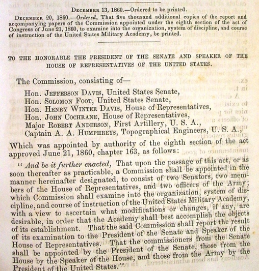 "Report Of The Commission Appointed Under The 8th Section Of The Act Of Congress Of June 21, 1860 To Examine Into The Organization, System Of Discipline, And Course Of Instruction Of The United States Military Academy At West Point" Rare 1860 Congressional Report on the United States Military Academy at West Point Headed by Jefferson Davis and Commented Upon Future Military Leaders of the Civil War including Winfield Scott, Robert E. Lee, George Meade, Joseph E. Johnston and George McClellan