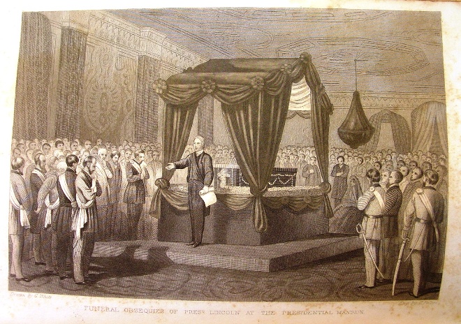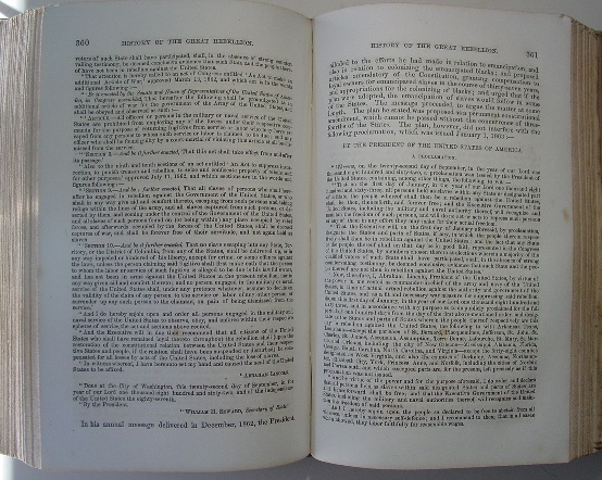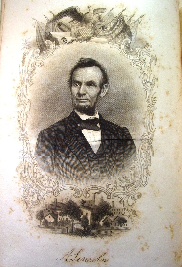 Published in Hartford, Connecticut in 1865 by L. Stebbins, the year the war ended. Spine with gilt lettering and blind-tooled fillets, cover with blind-tooled borders. 4to Illustrated with a tissue-guarded steel-engraved portrait of Abraham Lincoln, 39 tissue-guarded steel-engraved plates and 13 maps showing all the important military points. 778 pages. Most of the pages with tissue guards for the steel engraving are foxed, including the title page which is opposite the Lincoln frontpiece engraving, but the text is not, as shown below is largely devoid of foxing.