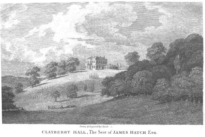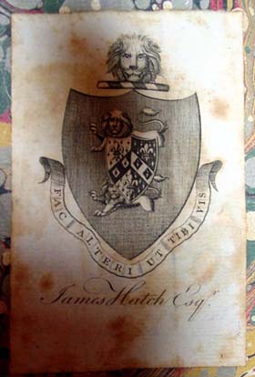 An interesting aspect of this book is its original ownership by James Hatch, Esq., a contemporary of Burke whose famous Claybury Hall was rebuilt and landscaped in the year that this volume of Reflections was published. Hatch, whose bookplate in the volume is shown above, was a peer and malt distiller from Bromley who had the landscaping on the grounds of Claybury Hall, shown in the period engraving below, done by the famous designer Sir Humphry Repton.