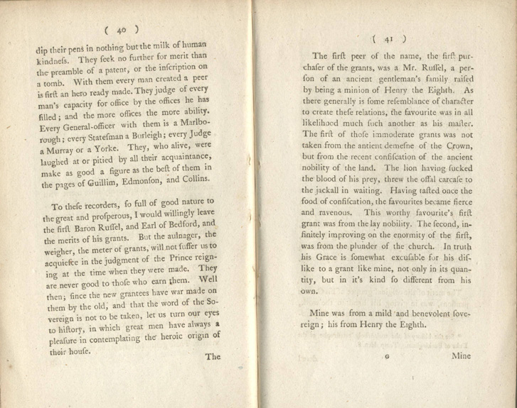 In another section Burke compares his services to King George III and England that garnered his pension and the services of the Duke of Bedford's ancestor to King Henry VIII that brought him such great wealth. You can read the unflattering result of Burke's analysis and other excerpts from this work here.