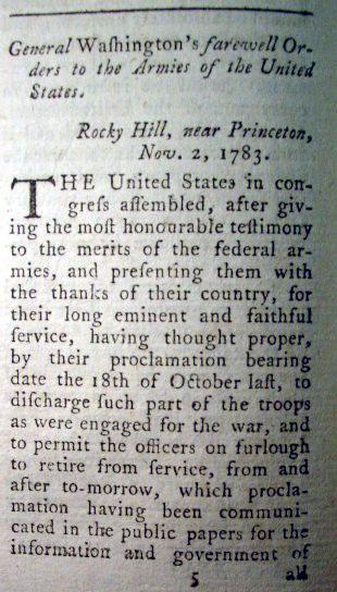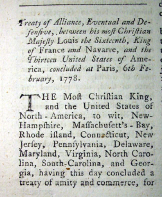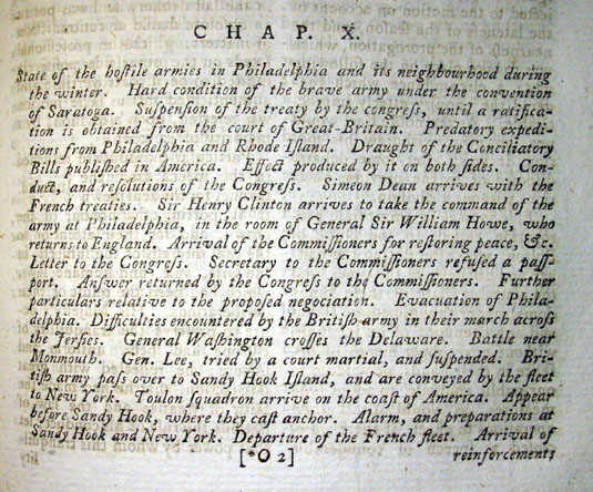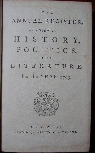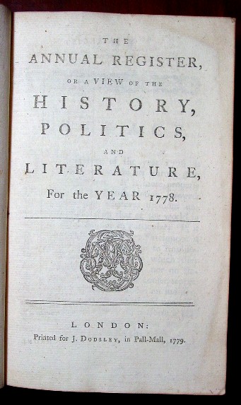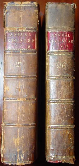 1778 though 1783 First Edition Full Leather Set of Annual Registers The Heart of the American Revolution This is a nice full leather set of Annual Registers, all first editions, that cover the Revolutionary War from 1778 through its end with the peace treaty recognizing the United States in 1783. While there is much more than just the Revolutionary War in these volumes; literature, science and exploration are fully covered as well, the reason they are on this web site and more valuable than most short runs of the Register is the coverage of the momentous event that made the United States an independent nation. Rather than try to describe the entire contents, some of which is addressed in the descriptions of individual years, the narrative and pictures below focus on the starting and ending volumes of this run. In the middle, unaddressed here, is one of our favorite volumes, 1781, which you can learn about here. The 1778 volume contains the reports of the Revolutionary War starting in July 1777 (p. 36), so the volume contains a narrative of the events leading up to the critical battle of Saratoga and reports on the important consequences, including the American negotiation of a treaty of alliance with France that would be so instrumental in the final favorable outcome of the War. The volume focuses on the debate in Parliament over the conduct and consequences of the war, but also includes the accounts of the military action, as shown by the summary of chapter X below: The 1778 volume also contains considerable full text documents and transcripts of the American Continental Congress and the full text of the Treaty of Alliance with the King of France, the start of which is shown below: The 1783 volume contains a number of important full text document in the Chronicle appendix including George Washington's famous Newburgh address to stem a revolt of officers in the final days of the war and Washington's farewell orders . The start of those historic documents are shown below: