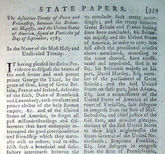 The most important document in the volume is the treaty with Great Britain formally recognizing American independence that is included in the State Papers section with other peace treaty documents. As shown below, the treaty specifically mentions John Adams and Benjamin Franklin who were America's negotiators. Below are the nice and clean title pages of the 1778 and 1783 volumes and further down are more pictures of the condition of the volumes.