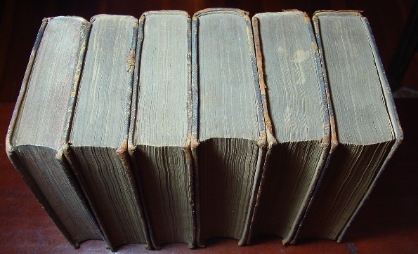 The start and ending volumes are shown in close-up above, as well as the bookplate of Captain Pat Hunter in the last volume. There are no library or other writings in the books except on the first volume's second free end paper is the name "J. Dandridge Sr." in small script. The text block and top of the volumes are shown below. Price: SOLD