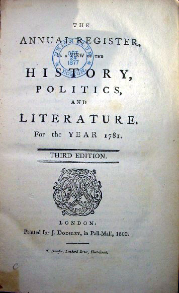 1781 Annual Register Historic Battles of Yorktown and Guildford Court House Benedict Arnold's British Reward for Treason and Capture, Trial and Hanging of Major Andre Benedict Arnold attack on New London and Groton, Connecticut Captured Letters of Washington and Adams and Full Revolutionary War News