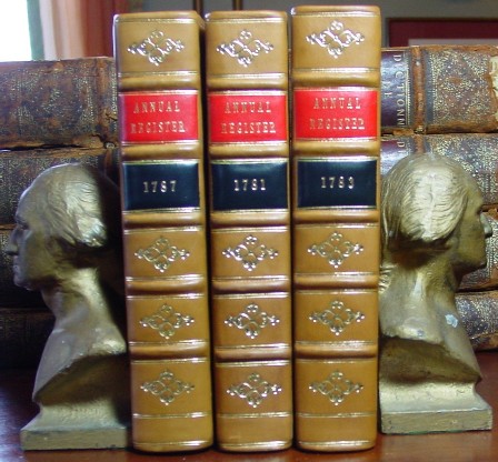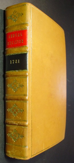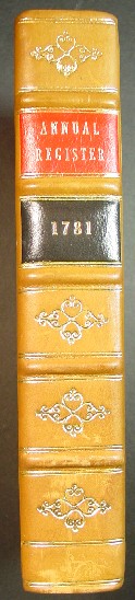 Benedict Arnold was sent on another diversion to draw Washington's army and the militia of New England as well as to penalize the American privateers feasting on British shipping in Long Island Sound. Arnold's raid on New London and Groton and the Battle of Fort Griswold are recounted in this volume and a web site carries the 1781 Annual Register's account in full. In addition, a document which is signed by some of the brave Americans who defended Fort Griswold is available here. There is much more in this volume, including interesting letters concerning war matters from George Washington and John Adams that were captured by the British. Rather than recount them all the list we made of the items that struck our fancy when we read it are listed on a separate web page that can be reviewed by clicking here. Besides the single volumes available below, this volume is also available in a first edition in both the 1758 through 1791 and the 1778 though 1783 Revolutionary War leather set of Annual Registers. 1781 Fine Leather First Edition This is a first edition of the 1781 Annual Register in a fine full leather binding executed by Green Dragon Bindery. Price: $325 Pay securely with credit card through PayPal by clicking the button below 1781 Full Leather First Edition