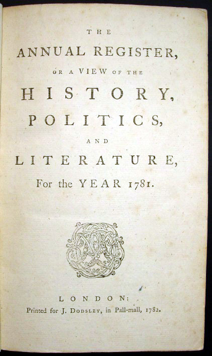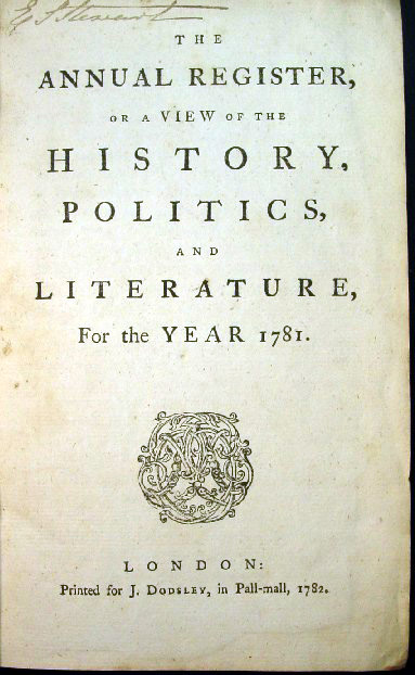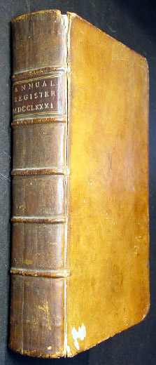 This is a full leather first edition of the 1781 Annual Register in nice condition. There is some wear to the boards as shown and some cracks were the spine meets the boards, but the boards are firm and the text is very clean. There is an early ownership signature at the top of the title page (E. J. Stewart ?, as shown above) but no other markings Price: SOLD