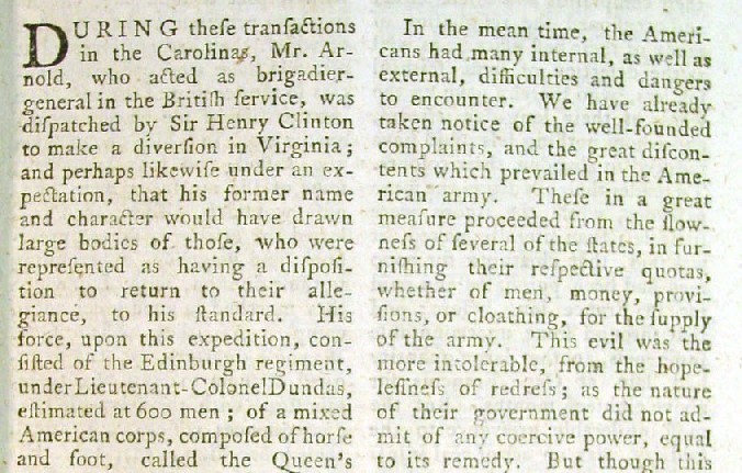 The first mention of Benedict Arnold as a British General is shown below, which mentions his activities in Virginia "to make a diversion," probably to draw Washington's troops to the South because the British believed he was going to make an attempt on New York. The article shown below also notes the discontent in the Continental Army earlier in the year as a result of lack of pay and provision caused by the weak federal government formed by the Articles of Confederation ("the nature of their government did not admit of any coercive power, equal to its remedy.")