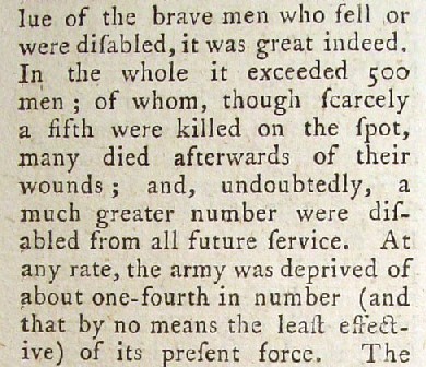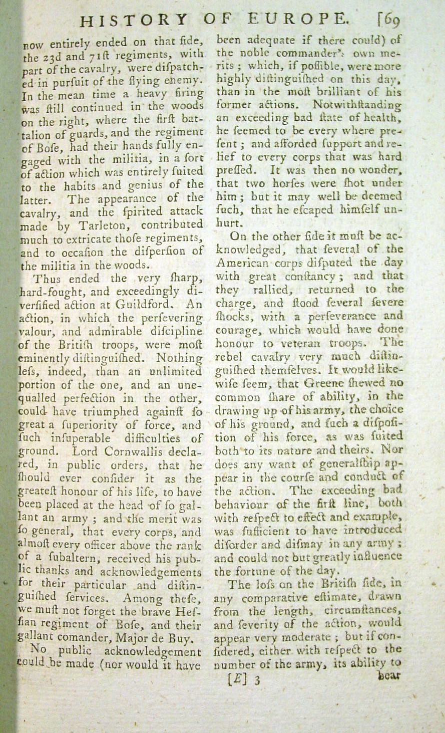 One of the most significant battles of 1781 that led directly to the battle of Yorktown is the Battle of Guildford Court House. A full page description of the end of the battle and part of the assessment of the performance of the British and American troops can be read by clicking on the thumbnail below which will pop up a high resolution photograph of a full page of the Annual Register account. The end of the account of the battle notes that the British killed exceeded 500, a fourth of their total force (See below). Later upon hearing from the British administration and press the reports of the great victory, Charles James Fox, one of Edmund Burke's Whig allies, commented that, "Another such victory would destroy the British army."
