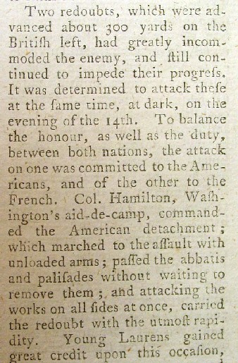 The Annual Register for the year 1781 covers important developments in the Revolutionary War which finally convinced the British public and Parliament that they could not "bring the American colonies to obedience." The most important battle of the war that convinced the British of that conclusion was the defeat of Lord Cornwallis at the Battle of Yorktown by the Continental Army under George Washington and the French Army under comte de Rochambeau. This volume provides extensive coverage of that battle and the events that led to that decisive battle (e.g., the Battle of Guildford Court House, Greensboro, North Carolina). It also covers the actions of the notorious traitor Benedict Arnold, who was rewarded with the rank of British Brigadier General, in his exploits in Virginia and his raid on New London and Groton, Connecticut. The capture, trial and hanging of Arnold's co-conspirator and spy, British Major Andre, are also covered in great detail. Captured letters from George Washington and John Adams concerning the progress of the war and its finances are also provided in full text in the State Papers section. The Battle of Yorktown warrants and gets full coverage, even some of the little details. For instance, the attack on the two redoubts, one of which was led by "Col. [Alexander] Hamilton, Washington's aid-de-camp" is described, as shown below left. The thought processes and actions of Lord Cornwallis that led to surrender are given a full account, including noting that "it would have been cruelty in the extreme to have sacrificed such gallant, and in every respect deserving troops, to a point of honour, which the improved state of civilization has wisely exploded..." Cornwallis wanted more favorable surrender terms, but British conduct in treating the surrendered American garrison in Charleston in 1780 resulted in the British getting no better terms than were previously accorded the Americans.