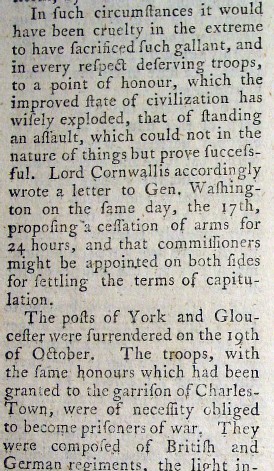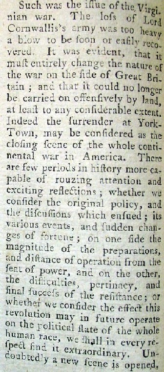 The account of the Battle of Yorktown ends with speculation on it effect, as shown below, and it was probably written by Edmund Burke, an opponent of the war who saw that this was the final event, for he says of Yorktown that it