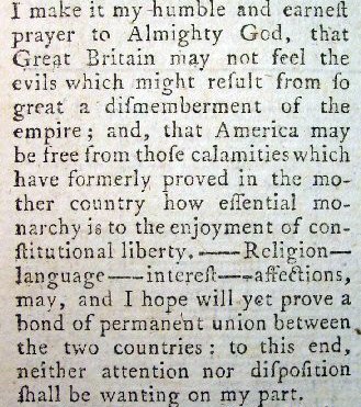 1783 Annual Register End of Revolutionary War - Peace Treaties and Recognition of American Independence George Washington Gives Up His Command of the Continental Army: Circular Address and Final Orders Emphasize Need For Stronger Federal Government The highlight of this volume is the acknowledgement by the King of England and the English Parliament that the former English colonies in America were free and independent states. In this volume that acknowledgement comes in a variety of forms, the full text of the speech of King George III in December 1782 in which he notes his offer "to declare them free and independent states," the full text of the September 1783 peace treaty between the United States and England signed by Benjamin Franklin and John Adams, and an extended history of the peace negotiations and significance of the treaty provisions. There are two more interesting historical items in this volume that flowed directly from those peace negotiations. The first was settling account with France, the biggest financial and military supporter of America during the war and the second was the resignation of George Washington as head of the Continental Army and his advice to his troops, Congress and Governors. Below are two excerpts from the speech of King George III to Parliament in December 1782 which for the first time acknowledged American independence and his self-serving wish that "America may be free from those calamities which have formerly proved in the mother country how essential monarchy is to the enjoyment of constitutional liberty." He was right that something more than the Articles of Confederation were needed, but it was not an monarchy, it was our own Constitution adopted in 1787.