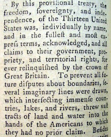 Below is part of the analysis of the treaty provision, here noting the "freedom, sovereignty and independence" granted as well as the "vast tracts of land" included within the agreed boundaries. The history section includes extensive information on the treaty negotiations as well as the debate in Parliament over the treaty provisions, especially regarding the treatment of Loyalists and their property.