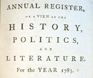 Much of the Annual Register for 1783 concerns event far from America in the British colony of India,. There the doings of the East India Company, Warren Hastings and British battles with Indians and the French occupy the first four chapters of the History of Europe Besides the single volumes available below, this volume is also available in a first edition in both the 1758 through 1791 multi-volume set and the 1778 though 1783 Revolutionary War leather set of Annual Registers. Fine Leather 1783 Annual Register 1st Edition