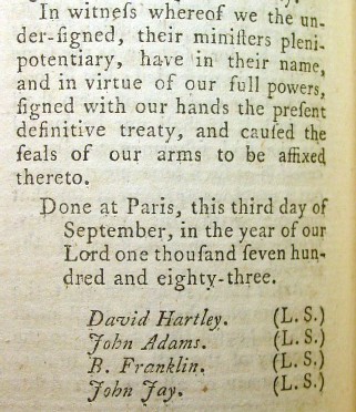 Below is the start of the full text of the final treaty between England and the United States granting independence, establishing borders, fishing rights and other matters and the signature page of the document.