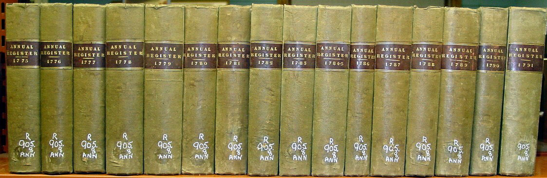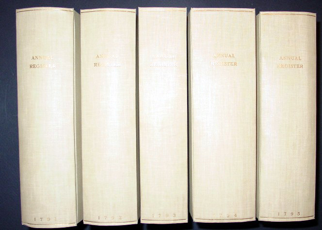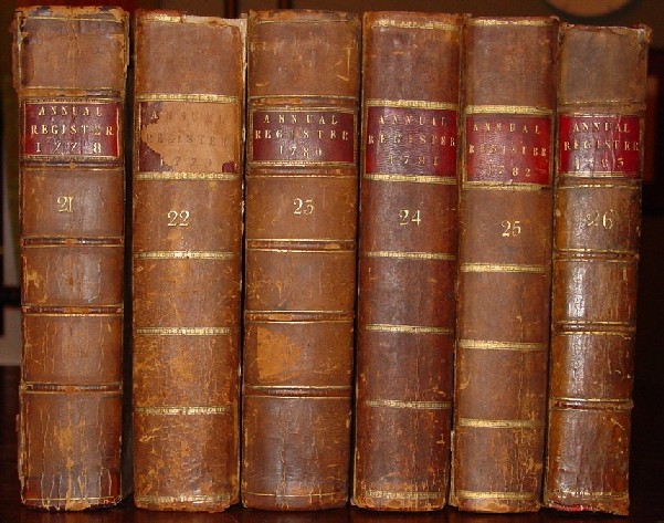 Multi-Volume Sets of the Annual Register (Click on the titles or pictures for more information and prices.) 1789- 1823 Verney set of the Annual Registers has interesting associations to Edmund Burke and Florence Nightingale. Ralph Verney, the 2nd Earl Verney, arranged the start of Edmund Burke's parliamentary career by giving Burke the House of Commons "pocket borough" seat from Wendover in 1765. Florence Nightingale's sister married Harry Verney and Florence spent a lot of time at the Claydon House where these books were housed. The volumes are also a totally 1st edition set! 1758 through 1791 first edition set of the Annual Registers in great condition, the 1775-1791 portion of the set is shown above. 1758 through 1773 full leather set of Annual Registers for the years of Burke's greatest contributions to the journal.