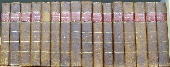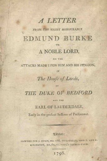 This page is the gateway to our inventory of the works of the great Edmund Burke and the opponents of his writings and speeches on controversial subjects, most notably the American and French Revolutions. Burke was an early opponent of the taxing and trade policies of the British government which helped cause the American Revolution and he was an opponent of British attempts to suppress the Revolution by force of arms. Those were highly unpopular positions from 1765 when he joined the House of Commons until he was proven right in 1781 with the British defeat at Yorktown. Burke was an early and forceful opponent of the French Revolution when much of the world, including America, was entranced by the dawn of the reign of liberty and justice that they believed was occurring in France. His 1790 "Reflections on the Revolution in France" was the first warning that the French Revolution may be fatally flawed and would lead to anarchy, mob rule and dictatorship to quell the disorder. That work also set out the intellectual foundation of the conservative political movement which has continued with vigor to the present day. While Burke's modern acclaim seems to be as a founding conservative he does not fit the mold of a backward looking politician upholding the status quo. During his life he fought for more religious and political freedom in Ireland, he was an opponent of many political and trade restrictions on the American colonies, he fought the patronage machine and royal prerogatives of King George III and he argued forcefully against the tide of public opinion for better treatment for the residents of the colony of India. And while he was the single most important opponent of the French Revolution for many good conservative reasons, he believed rich and poor suffered under the yolk of arbitrary revolutionary power and the predicted dictator who would clean up the chaos. This page provides links to the major works of Burke and the Annual Register which he founded and eloquently wrote and/or edited for thirty years. While that work contains some interesting original writing by Burke, especially in the early years, it also has independent value as the source of early publication of many documents and accounts of political, scientific and literary history. Highlights include the Declaration of Independence, the United States Constitution and maps of North America and the British empire in 1763. Our Annual Register inventory includes both individual volumes and complete sets of first editions. We probably have the largest inventory of Annual Registers in the world. Click on the titles or pictures below for more information and prices Show above is a full leather set of Annual Registers for the years 1758 through 1773, the years of Burke's greatest contributions to the journal. We have other sets of the Annual Registers, including one owned by Earl Verney who gave Burke his first seat in the House of Commons and very rare first edition sets from the 1700s that cover the Revolutionary War and French Revolution years. We also have individual years of the Annual Register available in the time period 1758-1823. See our inventory of Annual Registers here, which includes both individual volumes and first edition and other multi-volume sets "Memoir of the Life and Character of Edmund Burke" by James Prior, published in Philadelphia in 1825 We also have Burke's best single work, Reflections on the Revolution in France, bound by itself. This copy was owned by and has the armorial bookmark of James Hatch, Esq. a peer whose Craybury Hall was built the year of Burke's publication in 1790, with landscaping done by the great Sir Humphry Repton. This is the Earl of Abingdon's Thoughts on the Letter of Edmund Burke, Esq; to the Sheriffs of Bristol, on the Affairs of America, in which he criticized Edmund Burke for not opposing anti-American legislation more vigorously, including suspension of habeas corpus. A strong advocate of the American colonies, he explains why Parliament cannot violate the British constitution to suppress the American Revolution. We have first and second edition copies both published in 1777 in London. This is James Mackintosh's famous 1791 "Vindiciae Gallicae, Defence of The French Revolution and Its English Admirers." It is recognized by many, including Burke himself, as the best rebuttal to Burke's "Reflections on the Revolution in France." After the guillotining of the French King and the Reign of Terror Macintosh had the good manners to concede that Burke was right about the French Revolution and became one of Burke's admirers. This was one of Edmund Burke's last significant works, written and published in 1796 the year before his death. In Burke's "Letter to a Noble Lord" he skewers the Duke of Bedford for hypocrisy in questioning the King's grant of a pension to Burke compared to the Duke's own royal grant and explains Burke's opposition to the French Revolution and why he was helping to save the lands and lives of aristocrats like Bedford from the perverse "Frenchified" doctrines. It is one of Burke's more entertaining works. Click on the titles or pictures above for more information and prices |