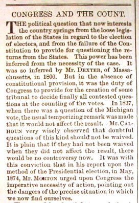 This historic volume of Harper's Weekly contains the first six months of weekly issues of 1877 which was a momentous year which started with tremendous strife and controversy over the election of 1876, the creation of an electoral commission to resolve the election and the inauguration of President Rutherford P. Hayes shortly after the matter was decided. This volume is in great condition. Very, very few 1877 volumes of these weekly magazines have survived in such good condition as this one, as shown by the pictures above and those which follow. These two articles appear on the first text page of this volume. They set out the difficult problem faced by the country with no rules to decide the election and the State of Florida the key to who would win much like the 2000 election. But unlike 2000, this was a much more serious controversy, with violence being threatened and the result not decided until just before inauguration day.
