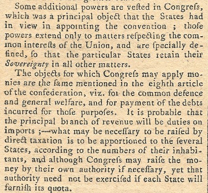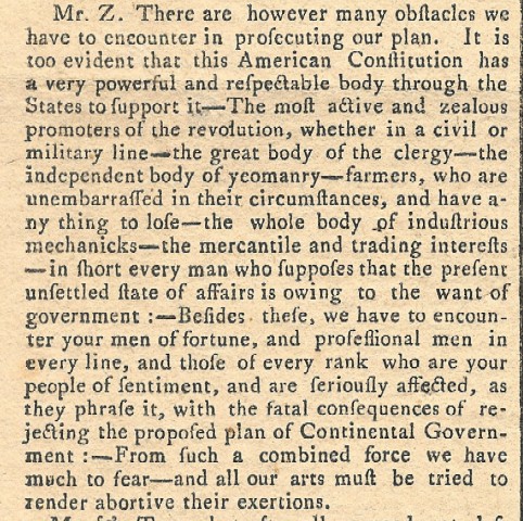 The article excerpted below is a mock correspondence between two opponents of the Constitution which gives arguments for the Constitution by attributing motives to the supporters and opponents.