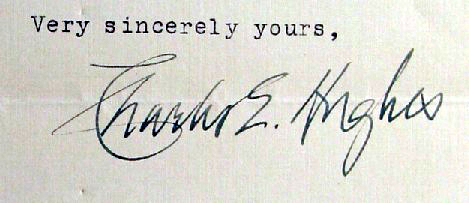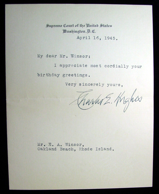 This is an odd little letter for the collector. Charles Evans Hughes was twice a Supreme Court justice, first under Presidents William Howard Taft and Woodrow Wilson as an Associate Justice, resigning to try to take Wilson's job in 1916, and later under Presidents Herbert Hoover and Franklin Roosevelt as Chief Justice. The letter is on Supreme Court stationary and dated April 16, 1945, but Hughes resigned from the Supreme Court in 1941 after he had worked vigorously and successfully to thwart Franklin Roosevelt's court packing scheme. So either the letter is misdated or Hughes continued to use Supreme Court stationary as his private stationary. Despite his advanced age (the letter responds to a greeting on his 82nd birthday on April 11), Hughes still pens a big, clear, vigorous signature for this letter. The letter comes with the Supreme Court envelope in which Hughes sent it, but the stamp has been cut out. Price: $85/SOLD
