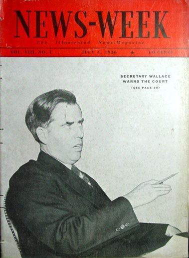 This July 4, 1936 issue of Newsweek magazine has Secretary of Agriculture Henry Wallace (later FDR's Vice President) with a scowl on his face pointing with a pencil and the caption "SECRETARY WALLACE WARNS THE COURT." Inside the the article on Wallace's warning to the Supreme Court is captioned "WALLACE: Secretary Declares Wisdom Will Avert Bloodshed." There has been much loose talk in media and political circles recently about "unprecedented" attacks on the judiciary by Republicans, but those claims show a profound ignorance of American history. Far more serious attacks on the judiciary and the Supreme Court were made by Presidents Andrew Jackson and Franklin D. Roosevelt and his minions like Secretary Wallace. Even the campaign to impeach Chief Justice Earl Warren in the 1950s and 1960s was a more serious attack on the judiciary than recent events. Here are some excerpts from the article, which was a review of Henry Wallace book, "Whose Constitution."