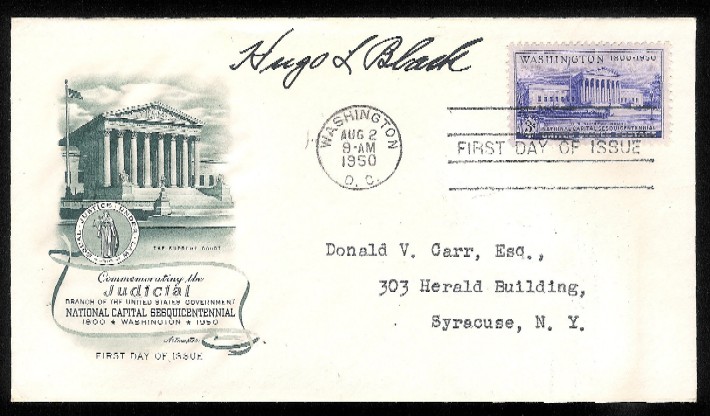 Justice Hugo L. Black Signed Postal Cover Honoring 150th Anniversary of the Judicial Branch